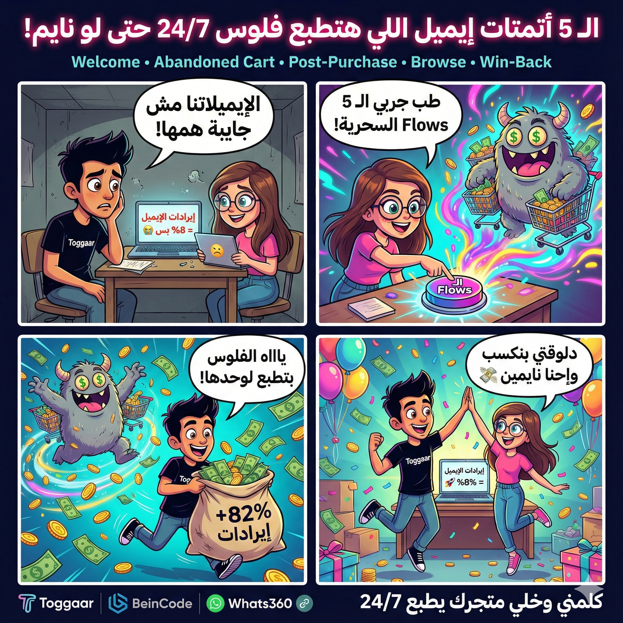 • الـ 5 Flows بس بيعملوا 70-90% من إيرادات الإيميل في أي متجر عربي ناجح 2025