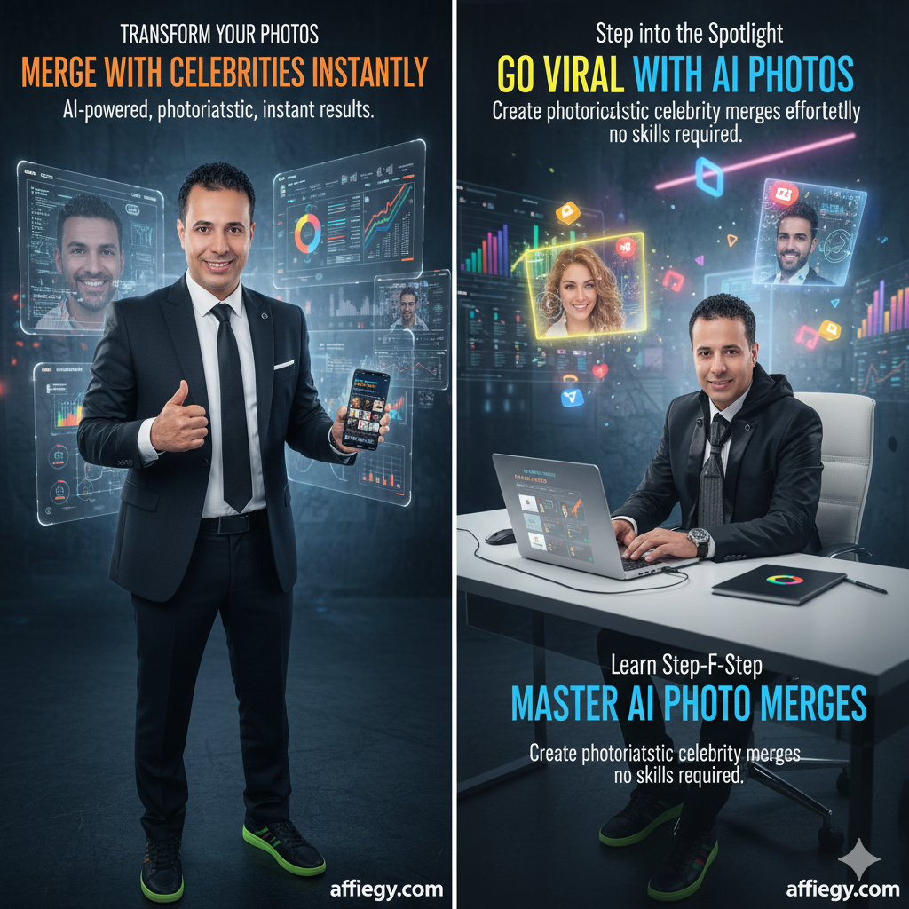 - “Hyper-realistic AI photo merge: my face perfectly blended with celebrity body, natural skin tones, realistic shadows, 8K”