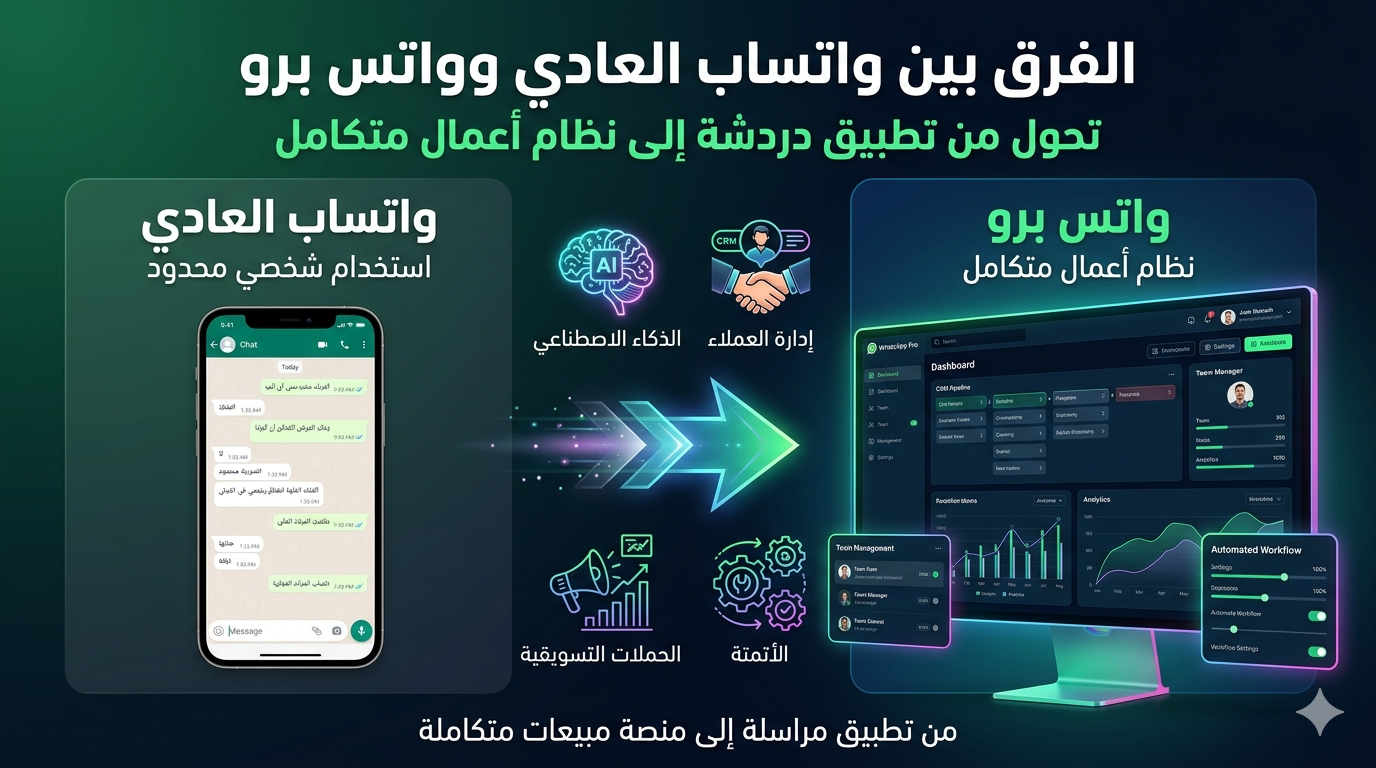 في عالم ينمو فيه الاقتصاد الرقمي بسرعة الصاروخ، لم يعد التواصل مع العملاء مجرد خيار تكميلي، بل أصبح العمود الفقري لاستدامة أي مشروع تجاري. لسنوات طويلة، ظل تطبيق واتساب هو الأداة المفضلة للتواصل الشخصي، ومع ظهور “واتساب بيزنس”، اعتقد الكثيرون أنهم وصلوا إلى قمة الاحترافية. لكن الحقيقة الميدانية تثبت غير ذلك؛ فالمؤسسات التي تطمح للنمو السريع والتوسع لا يمكنها الاعتماد على تطبيق جوال محدود المزايا. هنا يأتي التحول الجذري نحو “واتس برو” (WhatsApp Pro)، وهو المصطلح الذي يطلق على الأنظمة الاحترافية التي تعتمد على واجهات البرمجية (API) لربط واتساب بنظام إدارة علاقات العملاء (CRM)، والأتمتة، والذكاء الاصطناعي. هذا المقال يستعرض الرحلة الكاملة للتحول من مجرد تطبيق دردشة بسيط إلى منصة مبيعات وتسويق متكاملة تقود شركتك نحو المستقبل.