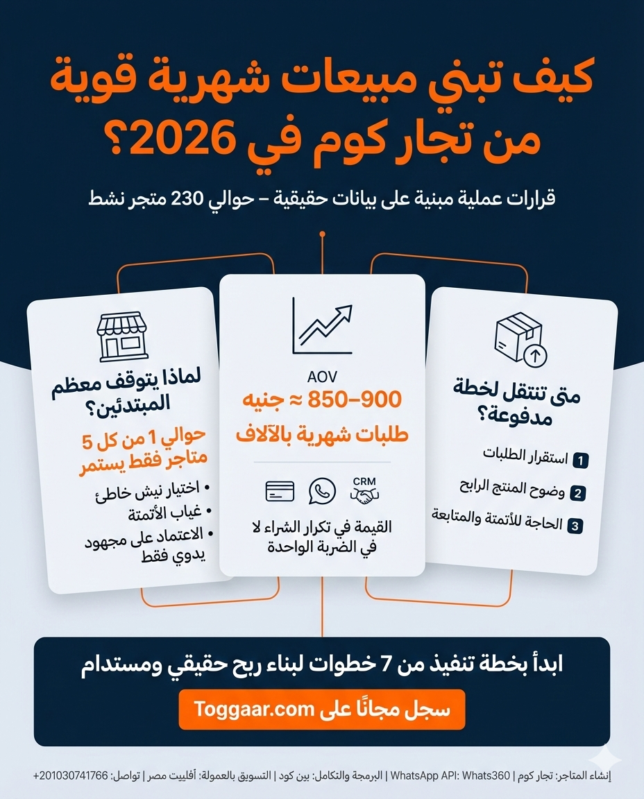 مثال مسوق مصري: مسوق محتوى بدأ بدون متجر، استخدم نظام الأفلييت الجاهز داخل Toggaar، وربط المتابعة الآلية بالعملاء عبر Whats360. النتيجة: عمولة ثابتة بدون خدمة عملاء ولا شحن.